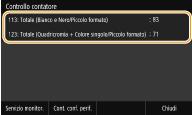È possibile controllare i totali separati per il numero di pagine utilizzate nelle stampe a colori e in bianco e nero. Questi numeri includono le stampe da stampa supporto memoria ed elenchi, nonché le stampe di dati dai computer.