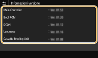 Verifica della versione del firmwareÈ possibile controllare la versione del firmware dal pannello operativo della macchina. Completata l'operazione di aggiornamento del firmware, verificare che l'aggiornamento sia stato eseguito correttamente. Verifica della versione del firmware |