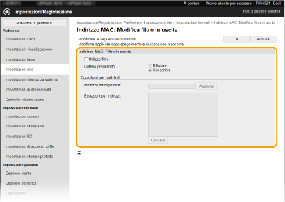 Selezionare la precondizione (criterio predefinito) per consentire o rifiutare la comunicazione di altri dispositivi con la macchina, quindi specificare gli indirizzi MAC per le eccezioni.