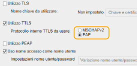 1 | Selezionare la casella di controllo [Utilizzo TTLS] o [Utilizzo PEAP]. Protocollo interno per TTLS È possibile selezionare MSCHAPv2 o PAP. |