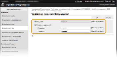 3 | Impostare nome utente e password. [Nome utente] Immettere dei caratteri alfanumerici per il nome utente. [Variazione password] Per impostare o modificare la password, selezionare la casella di controllo e immettere dei caratteri alfanumerici per la nuova password nelle caselle di testo [Password] e [Conferma]. |