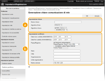 Quando è richiesto per la comunicazione tramite Transport Layer Security (TLS), è possibile generare una chiave e un certificato. È possibile utilizzare TLS quando si esegue l'accesso alla macchina tramite IU remota. I certificati autofirmati vengono utilizzati con la chiave e il certificato generati in "comunicazione di rete".