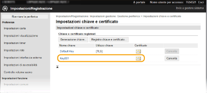 Fare clic su [Nome chiave] o [Certificato] richiesto per registrare il certificato.