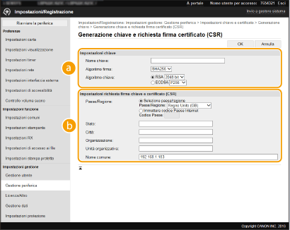 Poiché i certificati generati sulla macchina non hanno una firma CA, potrebbe verificarsi un errore di comunicazione in base ai dispositivi con cui comunica. Affinché l'autorità di certificazione emetta il certificato con la firma CA, è necessario ottenere i dati di CSR (Certificate Signing Request), che l'amministratore può generare dalla IU remota. Una volta emesso il certificato, registrarlo nella chiave con la CSR generata.