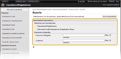Inserire una password per crittografare i dati da esportare usando caratteri alfanumerici. Inserire la stessa password in [Conferma]. Per esportare i dati, è necessario impostare una password di crittografia.