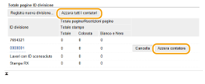 Se si desidera azzerare i conteggi, fare clic sul collegamento di testo corrispondente in [ID divisione] quindi fare clic su [Azzera contatore]  [OK]. Se si desidera azzerare i conteggi di tutti gli ID reparto, fare clic su [Azzera tutti i contatori]  [OK]. |