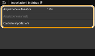 Immissione manuale di un indirizzo IP1 | Configurare un'impostazione per disabilitare l'acquisizione automatica. Modello con touchpanelSelezionare <Acquisizione automatica> e selezionare <Off> in <Acquisizione automatica> <Applica> <OK>. Modello con LCD bianco e neroSelezionare <Acquis. autom.> e impostare sia <Selezione protocollo> che <IP automatico> su <Off>. |