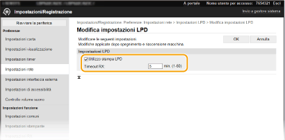 2 | Configurare le impostazioni in base alle esigenze. ![]() [Utilizzo stampa LPD] Selezionare la casella di controllo per stampare con LPD. Quando non si utilizza la stampa LPD, deselezionare la casella di controllo. [Utilizzo stampa RAW] Selezionare la casella di controllo per stampare con RAW. Quando non si utilizza la stampa RAW, deselezionare la casella di controllo. [Timeout RX] Impostare un valore come tempo di attesa riavvio per la ricezione dei dati. Se la ricezione dei dati non riprende entro il tempo impostato, la stampa viene annullata. |