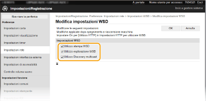 2 | Configurare le impostazioni in base alle esigenze. ![]() [Utilizzo stampa WSD] Selezionare la casella di controllo per stampare con WSD. Quando non si utilizza la stampa WSD, deselezionare la casella di controllo. [Utilizzo esplorazione WSD] Selezionare la casella di controllo per ottenere informazioni sulla macchina da un computer tramite WSD. La casella di controllo viene selezionata automaticamente quando la casella di controllo [Utilizzo stampa WSD] è selezionata. [Utilizzo Discovery multicast] Selezionare la casella di controllo per impostare la macchina per la risposta a messaggi di rilevamento multicast. Quando la casella di controllo è deselezionata, la macchina rimane in modalità di riposo anche se sulla rete è presente un flusso di messaggi di rilevamento multicast. |