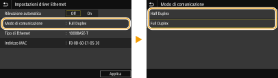 2 | <Modo di comunicazione> selezionare il modo di comunicazione.![]() <Half Duplex> Invia e riceve dati di comunicazione alternativamente. Selezionare quando la macchina è collegata a un dispositivo di rete che utilizza Half Duplex. <Full Duplex> Invia e riceve dati di comunicazione simultaneamente. Utilizzare questa impostazione per la maggior parte degli ambienti. |