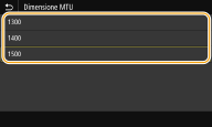 Nella maggior parte delle reti Ethernet, la dimensione massima del pacchetto che può essere inviato è di 1.500 byte. Un pacchetto è riferito a un blocco di dati in cui i dati originali vengono divisi prima di essere inviati. L'unità massima di trasmissione (MTU, Maximum Transmission Unit) può variare a seconda della rete. Modificare le impostazioni della macchina in base alle esigenze. Per ulteriori informazioni contattare l'amministratore di rete.