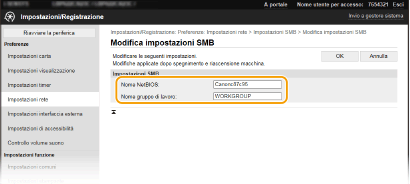 Il nome del gruppo di lavoro è un nome per il raggruppamento di più computer in modo che le funzioni di rete di base, come la condivisione di file, diventino disponibili in una rete Windows. Specificare il nome del gruppo di lavoro per identificare il gruppo a cui appartiene la macchina.