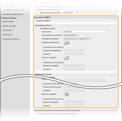 Il Protocollo Simple Network Management (SNMP) è un protocollo per il monitoraggio e il controllo dei dispositivi di comunicazione in una rete tramite Management Information Base (MIB). La macchina supporta SNMPv1 e SNMPv3 con sicurezza potenziata. È possibile verificare lo stato della macchina da un computer quando si stampano documenti o si utilizza la IU remota. È possibile abilitare SNMPv1 o SNMPv3 o entrambi contemporaneamente. Specificare le impostazioni per ogni versione, in modo da adeguarsi all'ambiente di rete e allo scopo di utilizzo.
