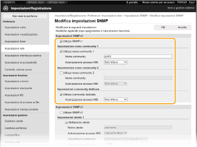 Se entrambe le versioni di SNMP sono abilitate, si consiglia di impostare le autorizzazioni di accesso MIB in SNMPv1 su [Solo lettura]. Le autorizzazioni di accesso MIB possono essere impostate indipendentemente in SNMPv1 e SNMPv3 (e per ogni ciascun utente in SNMPv3). Selezionando [Lettura/Scrittura] (autorizzazione di accesso completa) in SNMPv1 si annullano le solide caratteristiche di sicurezza che contraddistinguono SNMPv3 poiché la maggior parte delle impostazioni della macchina possono quindi essere controllate con SNMPv1.