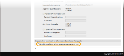 Selezionare la casella di controllo per abilitare il monitoraggio delle informazioni di gestione stampante della macchina tramite SNMP. Per disabilitare il monitoraggio delle informazioni di gestione della stampante deselezionare la casella di controllo.