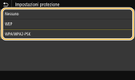 5 | Selezionare la chiave WEP desiderata. Modello con touchpanelSelezionare la chiave WEP modificata e selezionare <Registra>. Modello con LCD bianco e neroSelezionare <Seleziona chiave WEP> la chiave WEP modificata. |