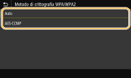 2 | Selezionare un metodo di crittografia. ![]() <Auto> Imposta la macchina per selezionare automaticamente AES-CCMP o TKIP in modo che corrisponda all'impostazione del router wireless. <AES-CCMP> Imposta AES-CCMP come metodo di crittografia. |