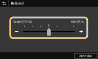 Sie können eine Vielzahl von Einstellungen für die Anzeige auf dem Bildschirm vornehmen, beispielsweise die Anzeigesprache: <Einstellungen Anzeige> Informationen zum Wechseln des Bildschirms, der automatisch angezeigt wird, wenn am Gerät eine bestimmte Zeit lang keine Funktion ausgeführt wurde: <Funktion nach automatischer Rückstellung> Sie können verschiedene Einstellungen in Bezug auf die Bedienbarkeit des Geräts wie beispielsweise die Bildschirmhelligkeit ändern: <Barrierefreiheit> |