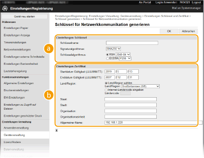 Legen Sie die Einstellungen für den Schlüssel und das Zertifikat fest.