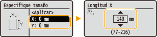 2 | Especifique la longitud del lado <X> y del lado <Y>. Modelo con pantalla táctil Seleccione <X> o <Y> e introduzca la longitud de cada cara con las teclas numéricas. Modelo con pantalla LCD en blanco y negro |