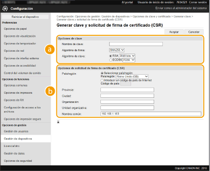 Cuando [SHA384] o [SHA512] están seleccionados en [Algoritmo de firma], [512 bits] no podrá seleccionarse como longitud de clave si está seleccionado [RSA] en [Algoritmo de clave].