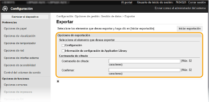Los datos de opciones del equipo pueden guardarse en su ordenador (exportación). Los datos guardados en su ordenador también se pueden registrar en el equipo (importación). Los datos exportados desde este equipo se pueden importar en otro equipo del mimo modelo. Así, podrá copiar fácilmente varios datos de opciones en múltiples equipos. Para utilizar esas características, tiene que haber iniciado una sesión en el modo de Administrador del sistema.