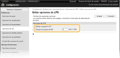 2 | Configure las opciones según sus necesidades. ![]() [Usar impresión LPD] Seleccione la casilla de verificación para imprimir a través de LPD. Cuando no utilice la impresión LPD, quite la marca de la casilla de verificación. [Usar impresión RAW] Seleccione la casilla de verificación para imprimir a través de RAW. Cuando no utilice la impresión RAW, quite la marca de la casilla de verificación. [Tiempo de espera de RX] Establezca un valor como tiempo de espera de reinicio para la recepción de datos. Si la recepción de datos no se reanudara dentro del tiempo establecido, la impresión se cancelará. |