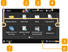 på kontrolpanelet. Brug denne skærm til at angive indstillinger for og registrere funktioner.![]() | Skift sideBrug denne funktion til at få vist en anden side på skærmen Hjem. Du kan også svirpe til siden for at skifte side. Mængde, der er tilbage i tonerpatronerneViser mængden af resterende toner i patronerne i intervaller. <Kontrollér tæller>Viser de separate totalværdier for udskrift i sort-hvid og farve. Visning af tællerværdien <Log ud>Brug denne knap til at logge ud fra maskinen. <Statusmonitor>Tryk for at kontrollere udskrivningsstatus, for at se brugshistorikken eller for at se netværksindstillinger som f.eks. maskinens IP-adresse. Du kan også tjekke maskinens status, f.eks. den resterende mængde papir eller den resterende mængde i tonerpatronerne, eller om der er opstået fejl. <Statusmonitor>-skærmen WiFi-ikonVises, når maskinen har forbindelse til et trådløst LAN. Brugernavn/IDNavn eller ID for den påloggede bruger vises. |