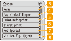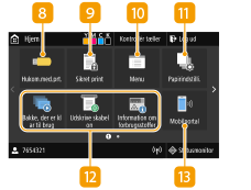 ![]() | <Menu><Funktionsindstillinger>, <Præferencer> og mange andre maskinindstillinger starter med denne knap. Liste over menuen Indstilling <Papirindstillinger>Denne knap bruges til at angive størrelsen og typen af papir, der er lagt i papirskuffen og universalbakken. Angivelse af papirformat og –type <Hukom.medieprint>Udskriver filer gemt på en USB-hukommelsesenhed. Udskrivning fra USB-hukommelse (hukommelsesmedieudskrivning) <Sikret print>Brug denne funktion til at udskrive et sikkert dokument. Udskr. et dok. sikret med en PIN-kode (sikret print) <Mobilportal>Brug denne til at etablere en forbindelse til en mobil enhed. Forbindelse til mobilenheder <Vis Ræk.flg. (Hjem)>Gør det muligt at ændre den rækkefølge, som Hjem-skærmknapperne vises i. Tilpasning af Hjem-skærmen |