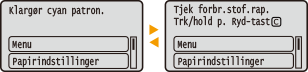 Der vises meddelelser på skærmen i situationer, som f.eks. når der ikke er mere papir, eller hvis tonerpatronens levetid er ved at udløbe. For flere oplysninger henvises til "Fejlfinding (FAQ)" på hjemmesiden for online-manualer.