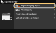 Når standardindstillingen er registreret, vises skærmen for papirindstillinger ikke, når der ilægges papir, og den samme indstilling bruges hver gang. Hvis du ilægger et andet papirformat eller en anden papirtype uden at ændre papirindstillingerne, kan maskinen ikke udskrive korrekt. For at undgå dette problem skal du vælge <Angiv ved ilægning af papir> i trin 3 og derefter ilægge papiret. |