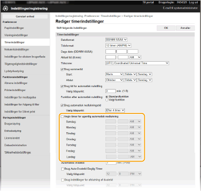 Marker afkrydsningsfeltet [Angiv timer for ugentlig automatisk nedlukning], og indstil tidspunktet, hvor der skal slukkes for strømmen.