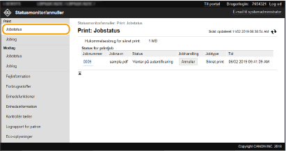 Uanset indstillingen for styring af afdelings-id'er vises alle dokumenter til udskrivning, der i øjeblikket udskrives eller venter på at blive udskrevet. Hvis du indtastede dit brugernavn, da du loggede på som almindelig bruger, vises dit brugernavn kun på de dokumenter, som du udskrev. Klik på [Jobnummer] på de midlertidigt afbrudte dokumenter, og sikr dokumenter for at vise detaljerede oplysninger. Du kan kontrollere brugernavnet og sideoptællingen for det udskrevne dokument. |