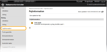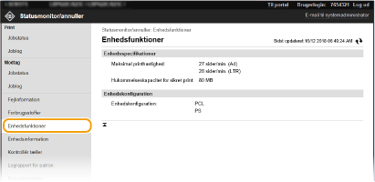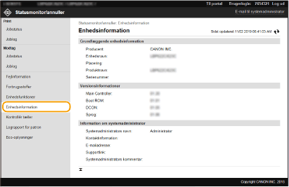 Information om maskinen og systemadministratoren vises. Enhedsnavnet og andre af systemadministratorens informationer, der er vist her, svarer til indstillingerne i [Information om systemadministrator] på siden [Brugerstyring] eller i [Informationer om enhedsindstillinger] på siden [Enhedsstyring].