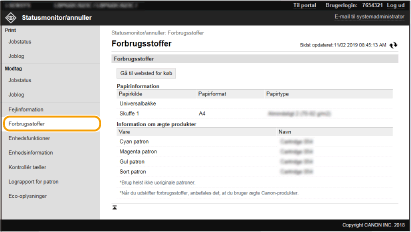 Papirformat og papirtype for papirkilde, modelnummer for tonerpatronen etc. vises. Du kan også klikke på [Kontrollér detaljer om forbrugsstoffer] på portalsiden (hovedsiden) for at få vist denne side (