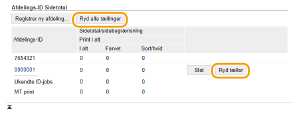 Nulstil optællingerne ved at klikke på det tilsvarende tekstlink under [Afdelings-ID], og klik derefter på [Ryd tæller]  [OK]. Nulstil alle optællingerne for alle afdelings-id'er ved at klikke på [Ryd alle tællinger]  [OK]. |