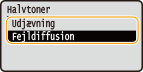 <Halvtoner> Du kan vælge, at den brugte udskrivningsmetode skal gengive halvtonerne (det mellemliggende område mellem de lyse og mørke områder på et billede) for at få den bedste billedkvalitet. <Udjævning> Udskriver billeder med fine overgange, f.eks. billeder fra digitalkameraer, men en jævn finish. <Fejldiffusion> Denne tilstand er egnet til udskrivning af data med tekst og tynde linjer samt kurvede linjer i CAD-data etc. Stabiliteten af teksturen og den fikserede toner kan blive reduceret, hvis <Fejldiffusion> bruges. |