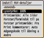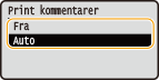 <Print kommentarer> Denne indstilling angiver, om der skal udskrives noter i PDF-filen. <Fra> Udskriver ikke noter. <Auto> Kun de noter, der er angivet til udskrivning i PDF-filen, udskrives. |