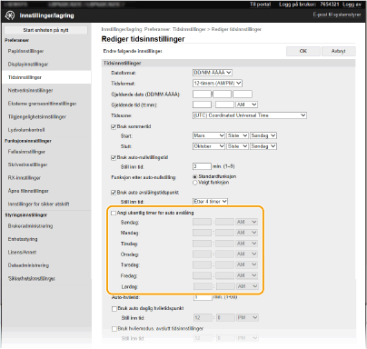 Kryss av boksen for [Angi ukentlig timer for auto avslåing] og angi klokkeslettet når strømmen skal slås AV.