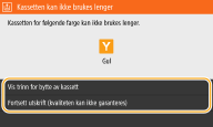 <Fortsett utskrift v/lite kass>/<Fortsett utskrift ved snart tom kassett> |