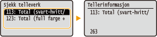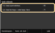 Du kan kontrollere separate totalsummer for antall sider brukt til fargeutskrifter og svart-hvitt-utskrifter. Antallet utskrifter omfatter utskrift fra minnemedia og listene, samt utskrift av data fra datamaskiner.