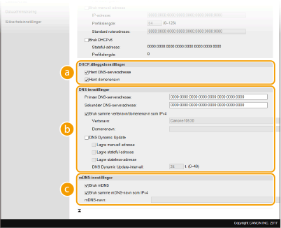 2 | Konfigurer IPv4 DNS-innstillinger. ![]() [DHCP-tilleggsinnstillinger][Hent vertsnavn] Merk av i boksen for å la alternativ 12 hente vertsnavnet fra DHCP-serveren. [DNS Dynamic Update] Merk av i boksen for å la alternativ 81 oppdatere DNS-postene dynamisk via DHCP-serveren. [Hent DNS-serveradresse] Merk av i boksen for å la alternativ 6 hente en DNS-serveradresse fra DHCP-serveren. [Hent domenenavn] Merk av i boksen for å la alternativ 15 hente et domenenavn fra DHCP-serveren. [Hent WINS-serveradresse] Merk av i boksen for å la alternativ 44 hente en WINS-serveradresse fra DHCP-serveren. [Hent POP-serveradresse] Merk av i boksen for å la alternativ 70 hente en POP3-serveradresse fra DHCP-serveren. [DNS-innstillinger][Primær DNS-serveradresse] Angi IP-adressen for en DNS-server. [Sekundær DNS-serveradresse] Angi IP-adressen for en sekundær DNS-server, hvis aktuelt. [Vertsnavn] Angi alfanumeriske tegn for vertsnavnet for maskinen som skal registreres på DNS-serveren. [Domenenavn] Angi alfanumeriske tegn for navnet på domenet der maskinen hører til, for eksempel "example.com". [DNS Dynamic Update] Merk av i boksen for en dynamisk oppdatering av DNS-postene når maskinens IP-adresse endres. Når du skal angi intervallet mellom oppdateringer, angir du tiden i timer i tekstboksen [DNS Dynamic Update-intervall]. [mDNS-innstillinger][Bruk mDNS] mDNS (multikast-DNS) brukes av Bonjour og er en protokoll for å knytte et vertsnavn til en IP-adresse uten bruk av DNS. Merk av i boksen hvis du vil aktivere mDNS, og angi mDNS-navnet i tekstboksen [mDNS-navn]. |