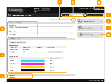 Näyttää laitteen nykyisen tilan ja virhetiedot. Jos on tapahtunut virhe, näytetään linkki virhetietosivulle.