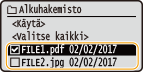 2 | Jos tiedostotyyppejä on erilaisia, valitse <JPEG/TIFF-tiedostot> tai <PDF-tiedostot>. |