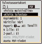 Voit tulostaa PDF-tiedostosta 9 tai 16 sivua kuvatietoja paperiarkin yhdelle puolelle käyttämällä toimintoa <N 1:lle> kohdassa <Aseta PDF-tiedot>. |