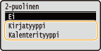 Yksipuolinen tulostus tai kaksipuolinen tulostus voidaan valita.
