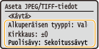 <Kirkkaus> Voit säätää kuvien kirkkautta. Säädä kirkkautta ja paina  . TIFF-tiedostojen <Kirkkaus> voidaan asettaa vain, kun ne ovat JPEG-pakattuja. |