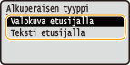 <Alkuperäinen tyyppi> Voit valita alkuperäisen tyypin tulostettavan kuvan mukaan. <Valokuva etusijalla> Etusija annetaan valokuvien hyvälle tulostukselle. <Teksti etusijalla> Etusija annetaan tekstin selkeälle tulostukselle. |