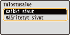 <Tulostusalue> Määritä tulostettavat sivut. <Kaikki sivut> Tulostaa kaikki sivut. <Määritetyt sivut> Määritä tulostettava sivualue. Syötä halutut arvot kenttiin <Ensimmäinen sivu> ja <Viimeinen sivu> numeronäppäimillä ja valitse <Käytä>. Jos määritetty sivualue ei vastaa mitään PDF-tiedoston sivua, tulostusta ei suoriteta. |