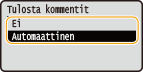 <Tulosta kommentit> Tämä asetus määrittää, tulostetaanko PDF-tiedoston huomautukset. <Ei> Ei tulosta huomautuksia. <Automaattinen> Tulostaa vain ne huomautukset, jotka on määritetty PDF-tiedostossa tulostettaviksi. |